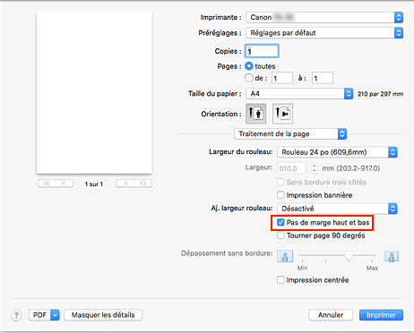 Lorsque vous imprimez sur un rouleau de papier, vous pouvez économiser du papier en réduisant les marges supérieure et inférieure lors de l'impression.