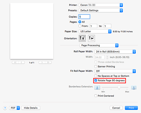 • Ao selecionar papel no formato retrato em Tamanho do papel (Paper Size) na caixa de diálogo de impressão, quando ele exceder a largura selecionada em Larg. papel em rolo (Roll Paper Width), Girar a página em 90 graus (Rotate Page 90 degrees) não poderá ser usado.