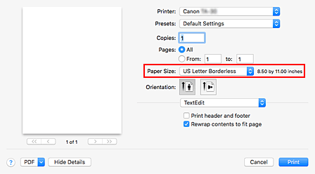 Выберите размер бумаги для печати без полей по всей поверхности бумаги