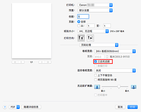 如果使用三边无边距打印功能,则可以合并与卷纸宽度不匹配的纸张尺寸,并在三边执行无边距打印。 但是,如果执行三边无边距打印,则需要在打印后裁切纸张的右侧。