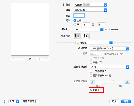 如果希望将源文档置于单页纸中央进行打印,或者相对于卷纸宽度左右等边距打印,请使用打印居中功能。