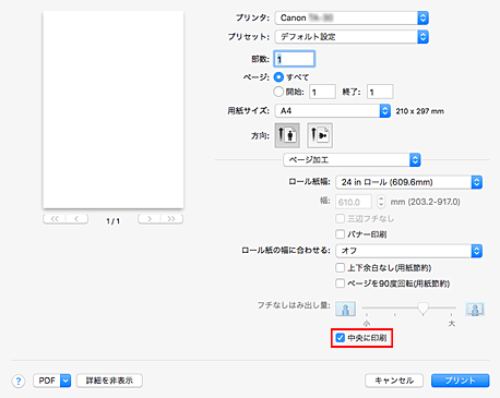 • プリントダイアログの[用紙サイズ]で「XXX 縁なし」(または「XXX フチなし」)を選んでいる場合、[中央に印刷]はグレー表示となり設定できません。