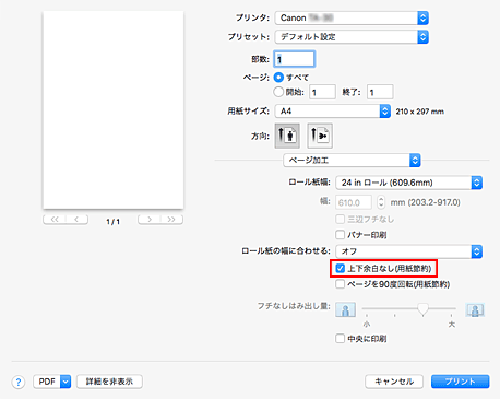 ロール紙に印刷するとき、上下の余白を減らして印刷することで用紙を節約することができます。