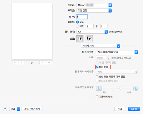 - 프린트 대화 상자의 용지 크기(Paper Size)에서 "XXX 테두리 없음" 또는 "XXX 커트지"를 선택한 경우 배너 인쇄(Banner Printing)는 회색으로 표시되고 설정할 수 없습니다.