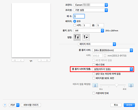 중요- 사용자 정의 용지 크기를 사용하여 전체 용지를 여백 없이 인쇄하는 경우 용지 크기(Paper Size)의 사용자 설정 크기 관리...(Manage Custom Sizes...)에서 프린터 여백(Non-Printable Area) 값을 모두 0mm로 설정하여 용지 크기를 만들고 페이지 처리(Page Processing)의 롤 용지 너비에 맞춤(Fit Roll Paper Width)에서 설정(테두리 있음)(On (Bordered))을 선택하십시오.