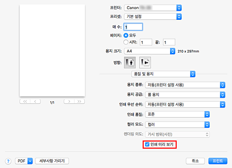 - PDF에서 Canon imagePROGRAF Preview를 선택한 경우에도 인쇄 결과를 표시할 수 있습니다.