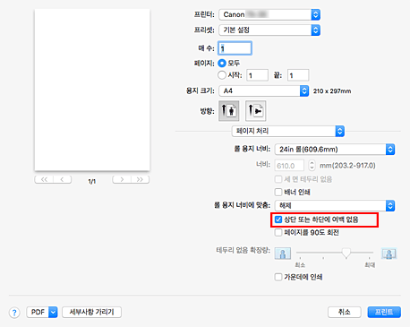 롤 용지에 인쇄하는 경우 상단 및 하단 여백을 줄여 용지를 절약할 수 있습니다.