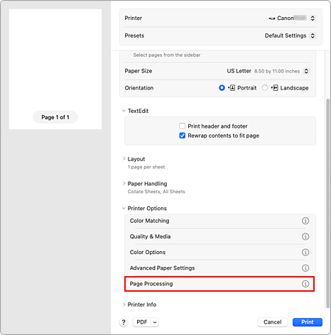 10. Seleccione Procesamiento de página (Page Processing) en Opciones de impresora (Printer Options)