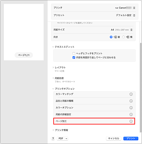 [プリンタオプション]から[ページ加工]を選ぶ