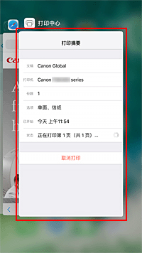 - 从iOS设备: 点击在多任务模式下显示的打印中心。 在显示的屏幕中,点击要删除的打印作业,然后点击取消打印。