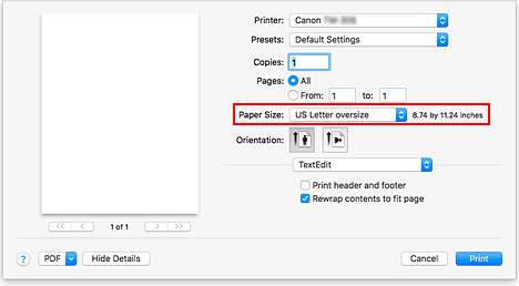 Wenn Sie ein erstelltes Dokument über die gesamte Papierbreite drucken, wählen Sie ein Papierformat aus der Liste "XXX Übergröße" aus (Größen, bei denen die für den Druckerbetrieb benötigten Ränder zur Dokumentgröße hinzugefügt wurden), damit alle Bereiche des Dokuments in ihrer tatsächlichen Größe gedruckt werden.