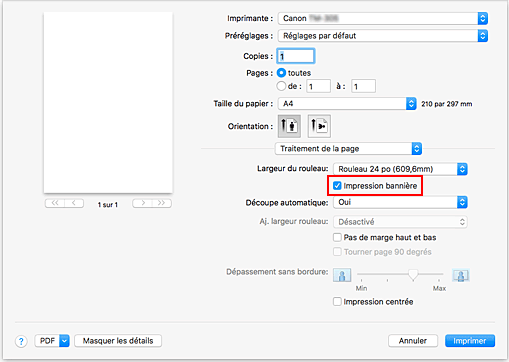 - Lorsque le paramètre « XXX sans bordure » ou « XXX feuille de découpe » est sélectionné pour Format papier (Paper Size) dans la boîte de dialogue Imprimer, l'option Impression bannière est grisée et ne peut pas être sélectionnée.