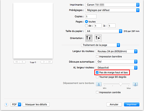 Lorsque vous imprimez sur un rouleau de papier, vous pouvez économiser du papier en réduisant les marges supérieure et inférieure lors de l'impression.