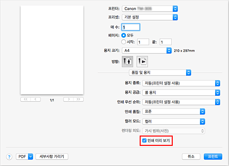 • PDF에서 Canon imagePROGRAF Preview를 선택한 경우에도 인쇄 결과를 표시할 수 있습니다.