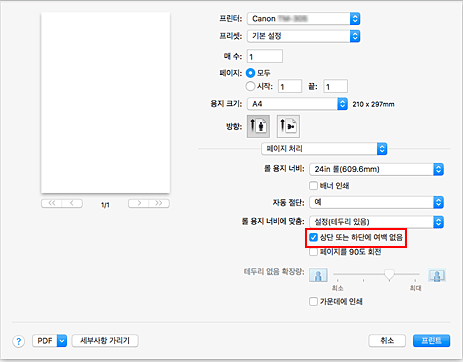 롤 용지에 인쇄하는 경우 상단 및 하단 여백을 줄여 용지를 절약할 수 있습니다.