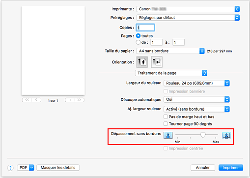 Important- Si le curseur de Dépassement sans bordure est positionné tout à droite, l'arrière du papier peut être taché lors de l'impression.