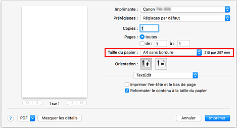 Sélectionnez le format papier pour une impression sans bordure en pleine taille