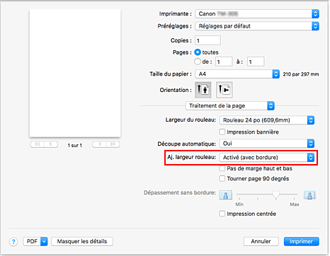 Important- Pour imprimer en pleine page sans bordure en utilisant une taille de papier personnalisée, créez un format papier en définissant toutes les valeurs de Zone non imprimable (Non-Printable Area) sur 0 mm dans Gérer les tailles personnalisées... (Manage Custom Sizes...) sous Format papier (Paper Size), puis sélectionnez Activé (avec bordure) pour le paramètre Aj. largeur rouleau sous Traitement de la page.