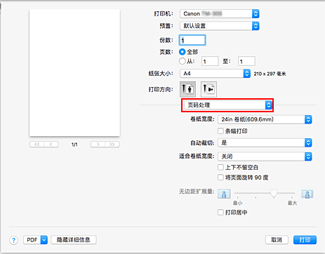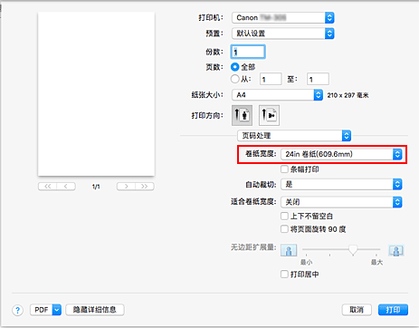 如果将纸张来源选择为卷纸,请将卷纸宽度设置为装入打印机的卷纸宽度。