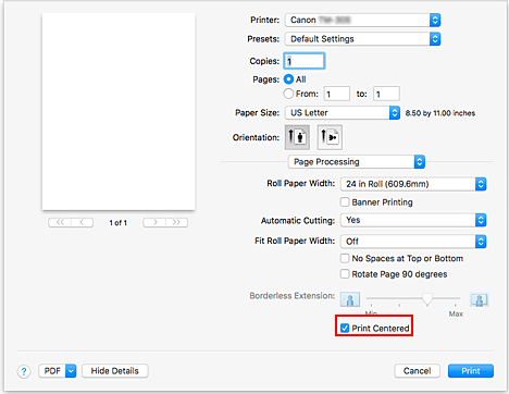 En el caso de que desee colocar el documento original en el centro de la hoja cortada o imprimir con idénticos márgenes a izquierda y derecha en relación a la anchura del rollo de papel, utilice la función Impresión centrada (Print Centered).
