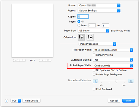 Selección de Encendido (con bordes) (On (Bordered)) o de Encendido (sin bordes) (On (Borderless)) para Aj. anch. rol. papel (Fit Roll Paper Width)