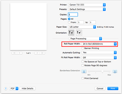 Se você selecionou papel em rolo para Origem do Papel (Paper Source), defina Larg. papel em rolo (Roll Paper Width) como a largura do papel em rolo carregado na impressora.