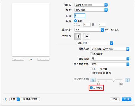 如果希望将源文档置于单页纸中央进行打印,或者相对于卷纸宽度左右等边距打印,请使用打印居中功能。