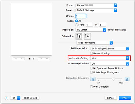Em Corte automático (Automatic Cutting), selecione a configuração correspondente ao que você deseja.