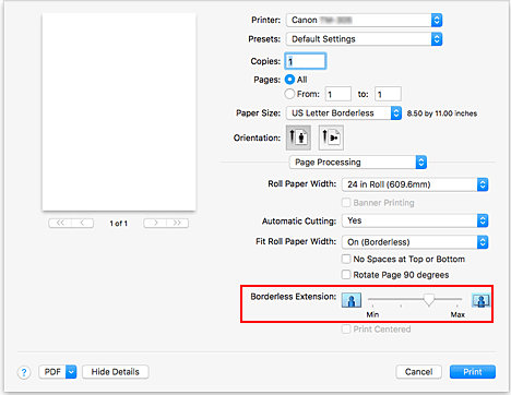 Внимание!- Если ползунок Без полей (расшир.) (Borderless Extension) установлен в правое крайнее положение, на обратной стороне бумаги могут появиться пятна.