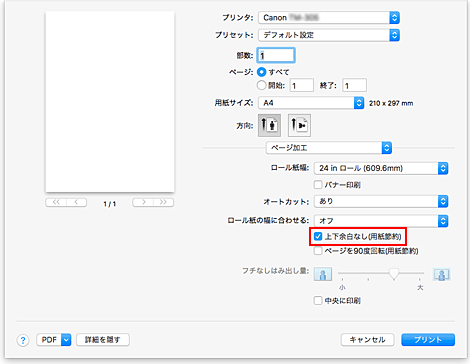 ロール紙に印刷するとき、上下の余白を減らして印刷することで用紙を節約することができます。