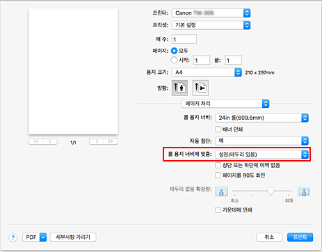 롤 용지 너비에 맞춤(Fit Roll Paper Width)에서 설정(테두리 있음)(On (Bordered)) 또는 설정(테두리 없음)(On (Borderless)) 선택