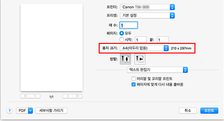 프린트 대화 상자의 용지 크기(Paper Size)에서 "XXX 오버사이즈"를 선택합니다.