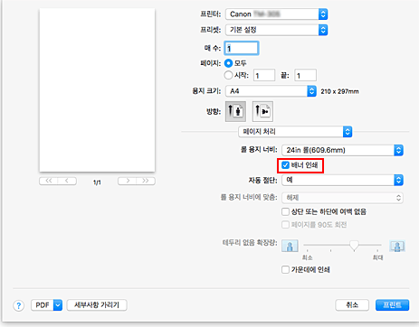 - 프린트 대화 상자의 용지 크기(Paper Size)에서 "XXX 테두리 없음" 또는 "XXX 커트지"를 선택한 경우 배너 인쇄(Banner Printing)는 회색으로 표시되고 설정할 수 없습니다.