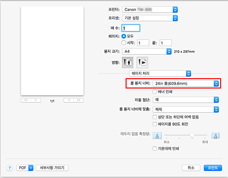 롤 용지 너비(Roll Paper Width)를 프린터에 로드한 롤 용지의 너비로 설정합니다.