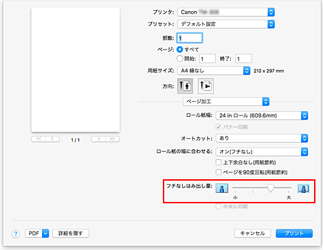 [ロール紙の幅に合わせる]で[オン(フチなし)]を選びます。