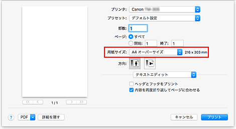 プリントダイアログの[用紙サイズ]で「XXX オーバーサイズ」を選びます。