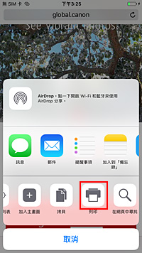 從iOS 10的Safari進行列印時,會顯示以下螢幕。 根據裝置或應用程式不同,螢幕會有所不同。