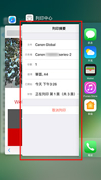 - 從iOS裝置:按兩下iOS裝置中的主畫面(Home)按鈕以切換至多工模式,向右滑動以顯示列印中心(Print Center),然後點選它。 在顯示的螢幕中,點選要刪除的列印作業,然後點選取消列印(Cancel Printing)。