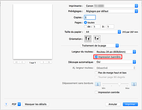 - Lorsque le paramètre « XXX sans bordure » ou « XXX feuille de découpe » est sélectionné pour Format papier (Paper Size) dans la boîte de dialogue Imprimer, l'option Impression bannière est grisée et ne peut pas être sélectionnée.