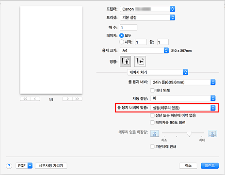 롤 용지 너비에 맞춤(Fit Roll Paper Width)에서 설정(테두리 있음)(On (Bordered)) 또는 설정(테두리 없음)(On (Borderless)) 선택