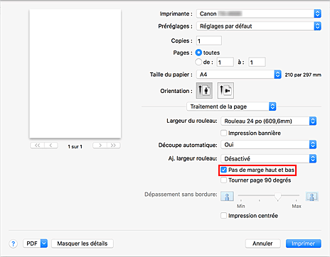 Lorsque vous imprimez sur un rouleau de papier, vous pouvez économiser du papier en réduisant les marges supérieure et inférieure lors de l'impression.