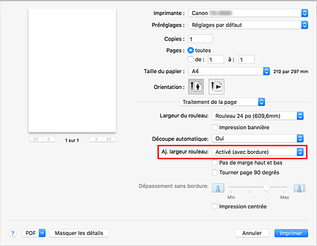 Pour Aj. largeur rouleau, sélectionnez Activé (avec bordure) ou Activé (sans bordure).