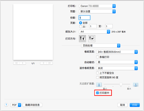 如果希望将源文档置于单页纸中央进行打印,或者相对于卷纸宽度左右等边距打印,请使用打印居中功能。
