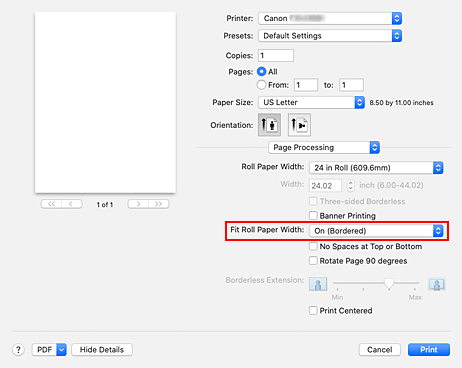Selezionare Attivato (con bordo) (On (Bordered)) o Attivato (senza bordo) (On (Borderless)) per Ad.a larg.carta rot. (Fit Roll Paper Width)