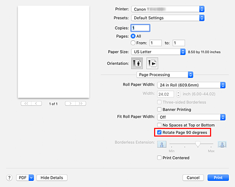 - Quando si seleziona la carta in formato verticale da Formato carta (Paper Size) nella finestra di dialogo Stampa, se la lunghezza è superiore alla larghezza selezionata in Largh. carta in rot. (Roll Paper Width), Ruota pagina di 90 gradi (Rotate Page 90 degrees) non può essere utilizzato.