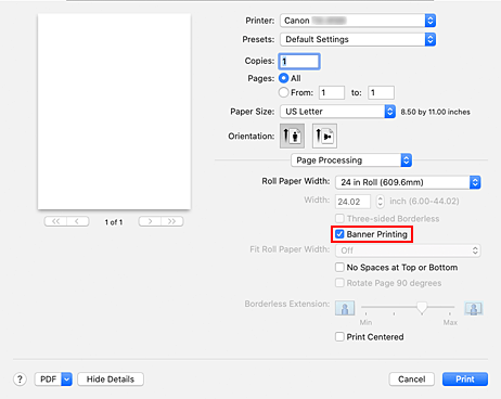 Marque a caixa de seleção Impressão de banner (Banner Printing).