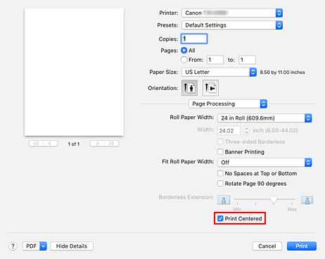 Если требуется поместить исходный документ в центре листовой бумаги или печатать с одинаковыми полями справа и слева по отношению к ширине рулона бумаги, используйте функцию Печать по центру (Print Centered).