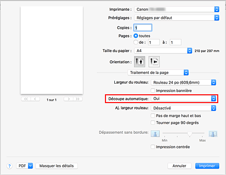 Pour couper le rouleau automatiquement et imprimer les marques de coupe, procédez comme suit :