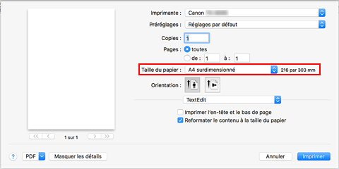 Dans la boîte de dialogue Imprimer, sélectionnez « XXX surdimensionné » pour Format papier (Paper Size).