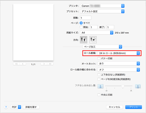 [給紙方法]でロール紙を選んだ場合は、[ロール紙幅]でプリンターにセットしているロール紙の紙幅と同じものを選びます。